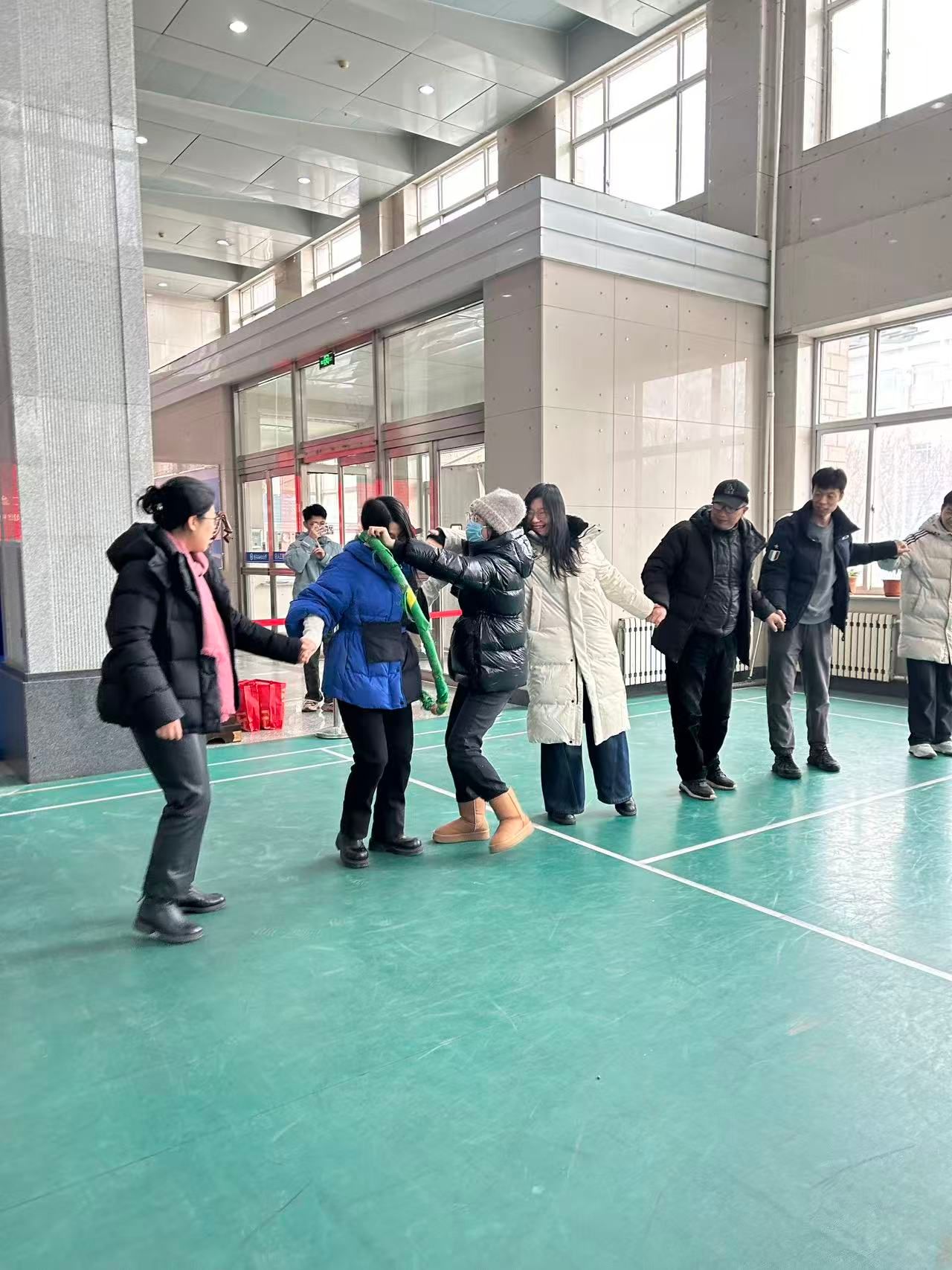 “一圈到底”项目成为团队协作的“试金石”。比赛中,各组队员手拉手紧密相连,在不松手的前提下,通过扭腰、下蹲、抬腿等灵活动作,让呼啦圈从队首依次传递至队尾。大家齐声喊着节拍,彼此配合调整节奏,即便呼啦圈偶尔掉落,队员们也迅速调整、重新开始。加油声、笑声此起彼伏,生动诠释了“心往一处想,劲往一处使”的团队精神。